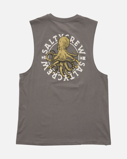 The Tentacles Muscle Tank in Charcoal is crafted from 160gsm ring-spun cotton jersey. It features a Salty Crew clamp label at the body hem and screen printed graphics on the front and back.